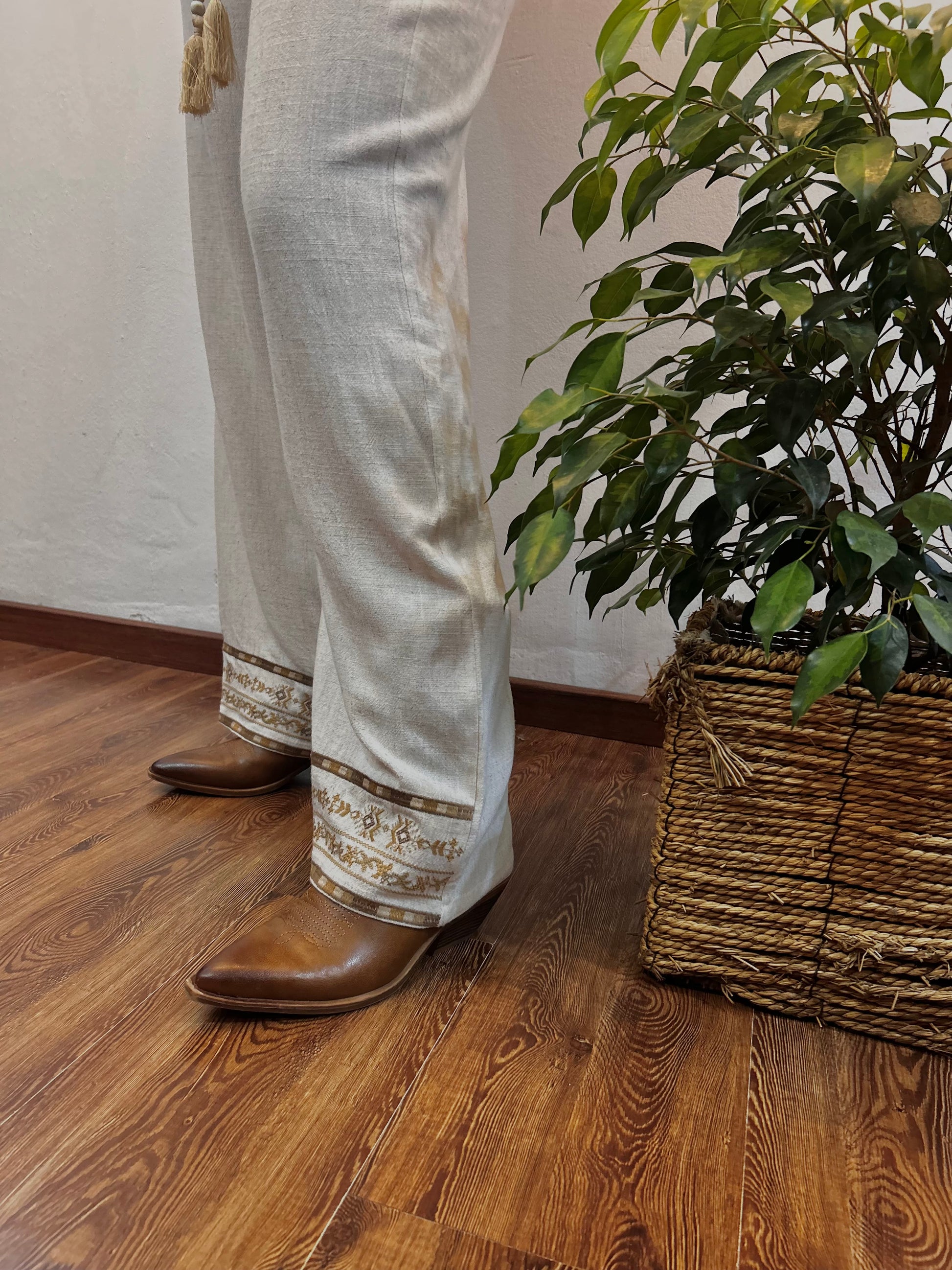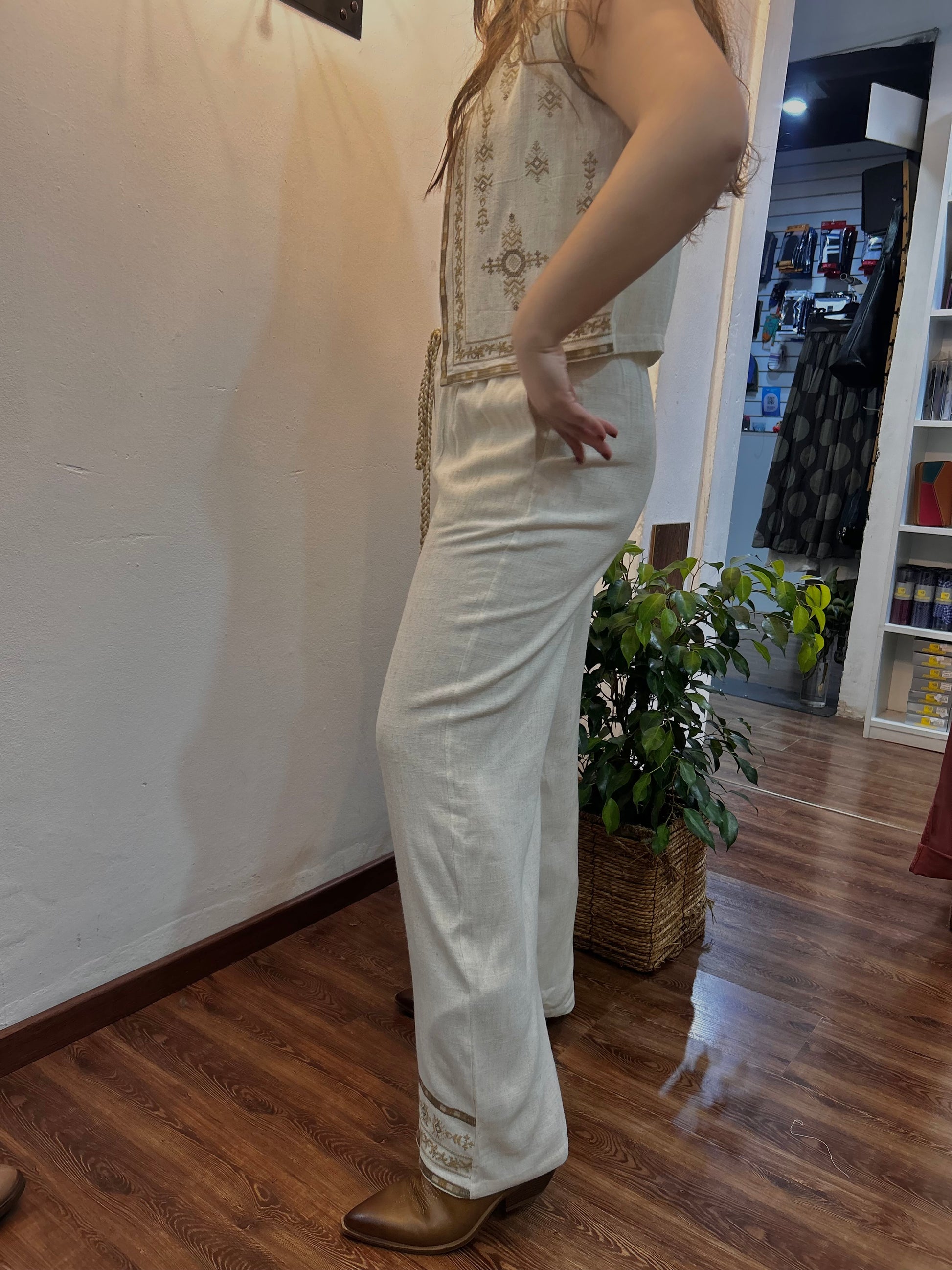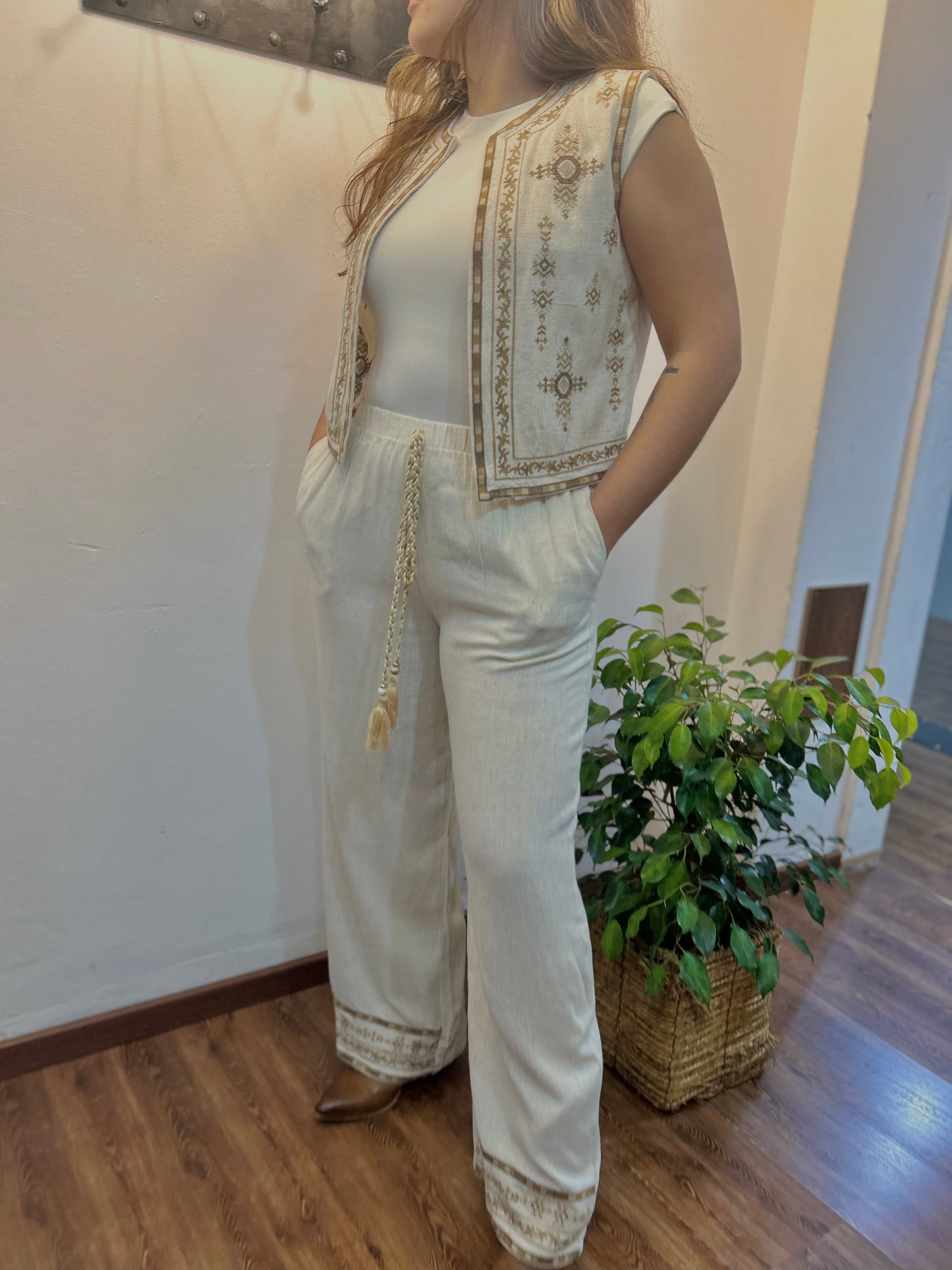 Pantalón de lino con detalles tejidos, tiene bolsillos y elástico. Muy cómodo y veraniego. Prenda italiana súper exclusiva.